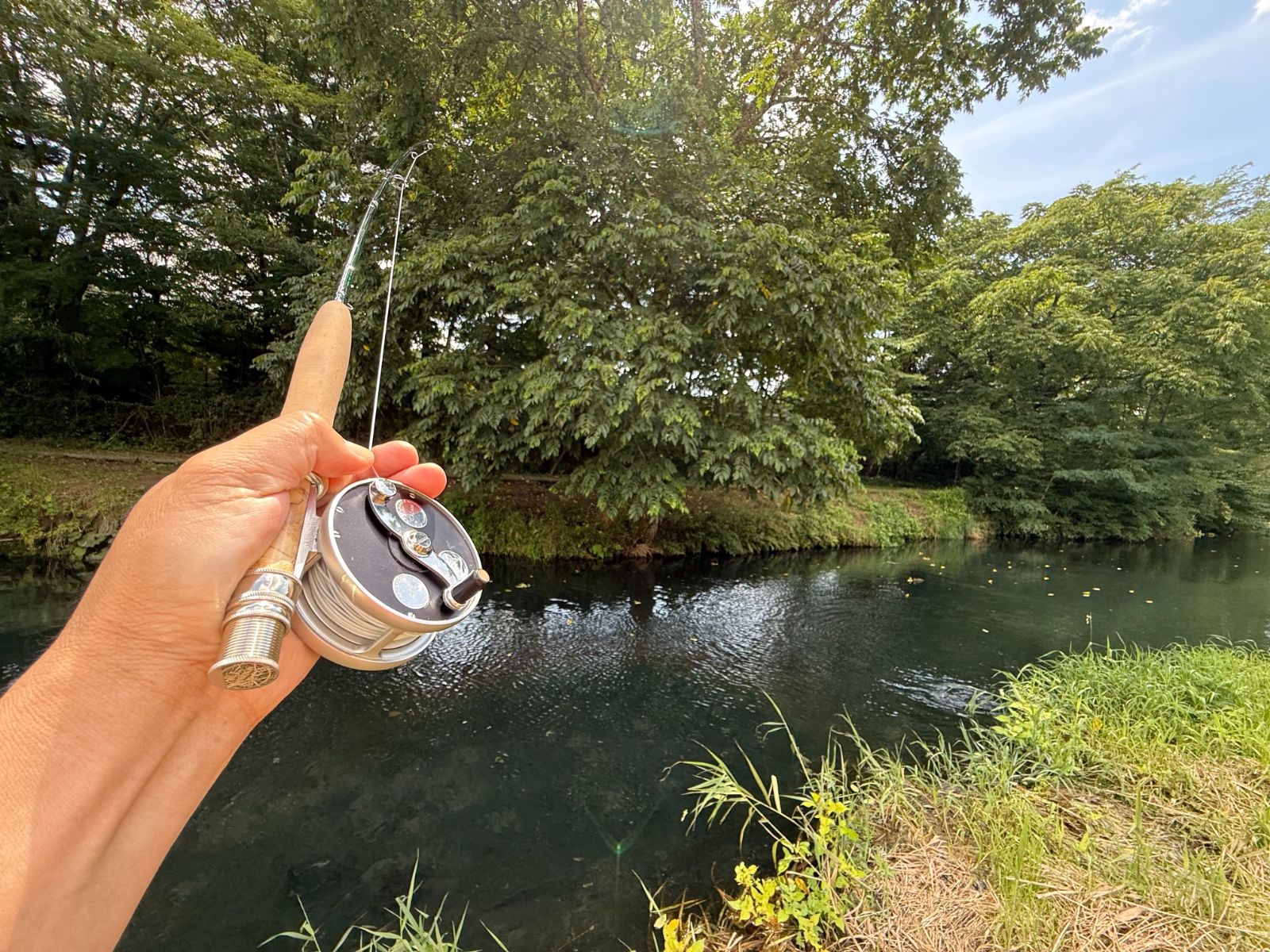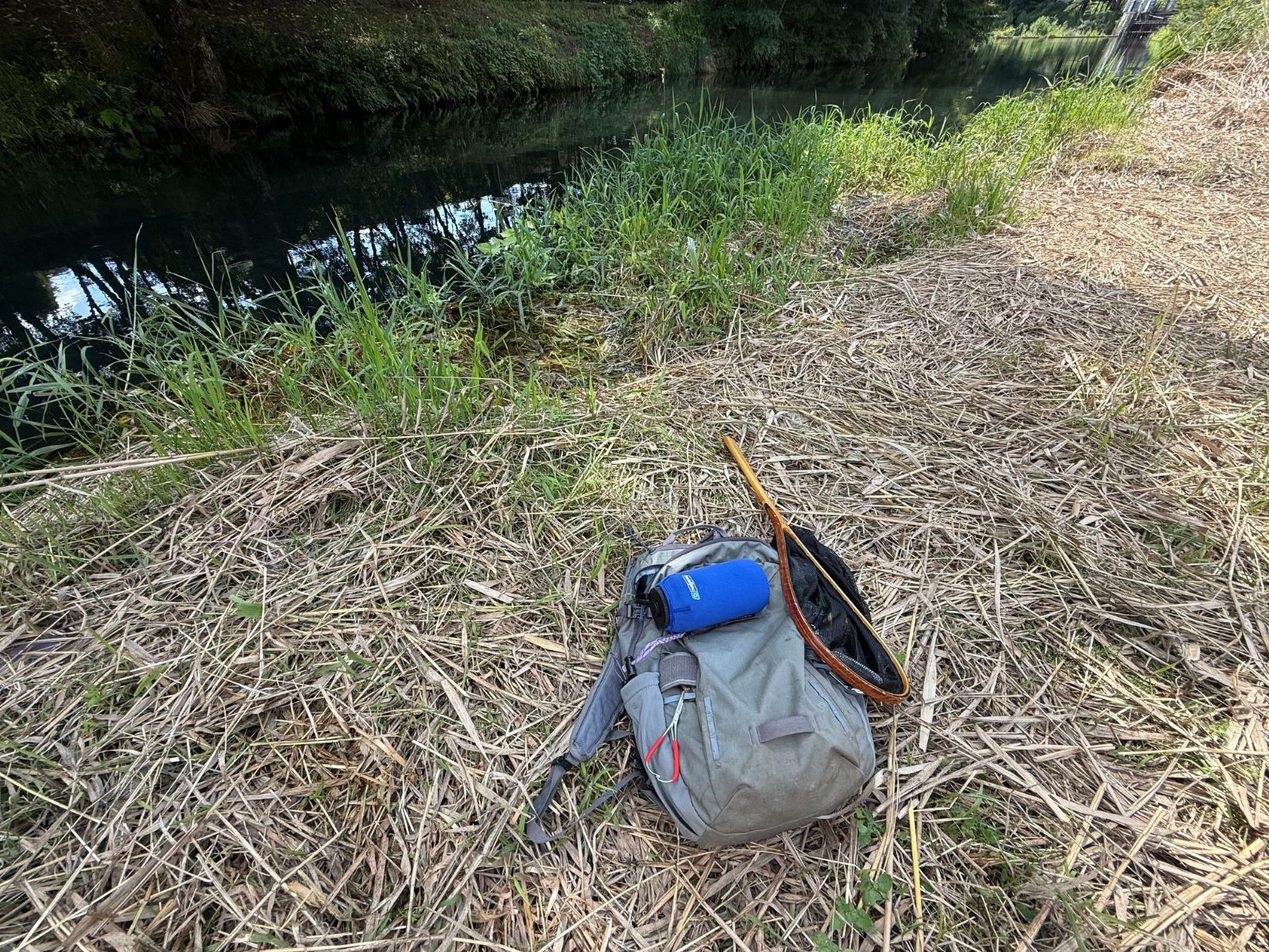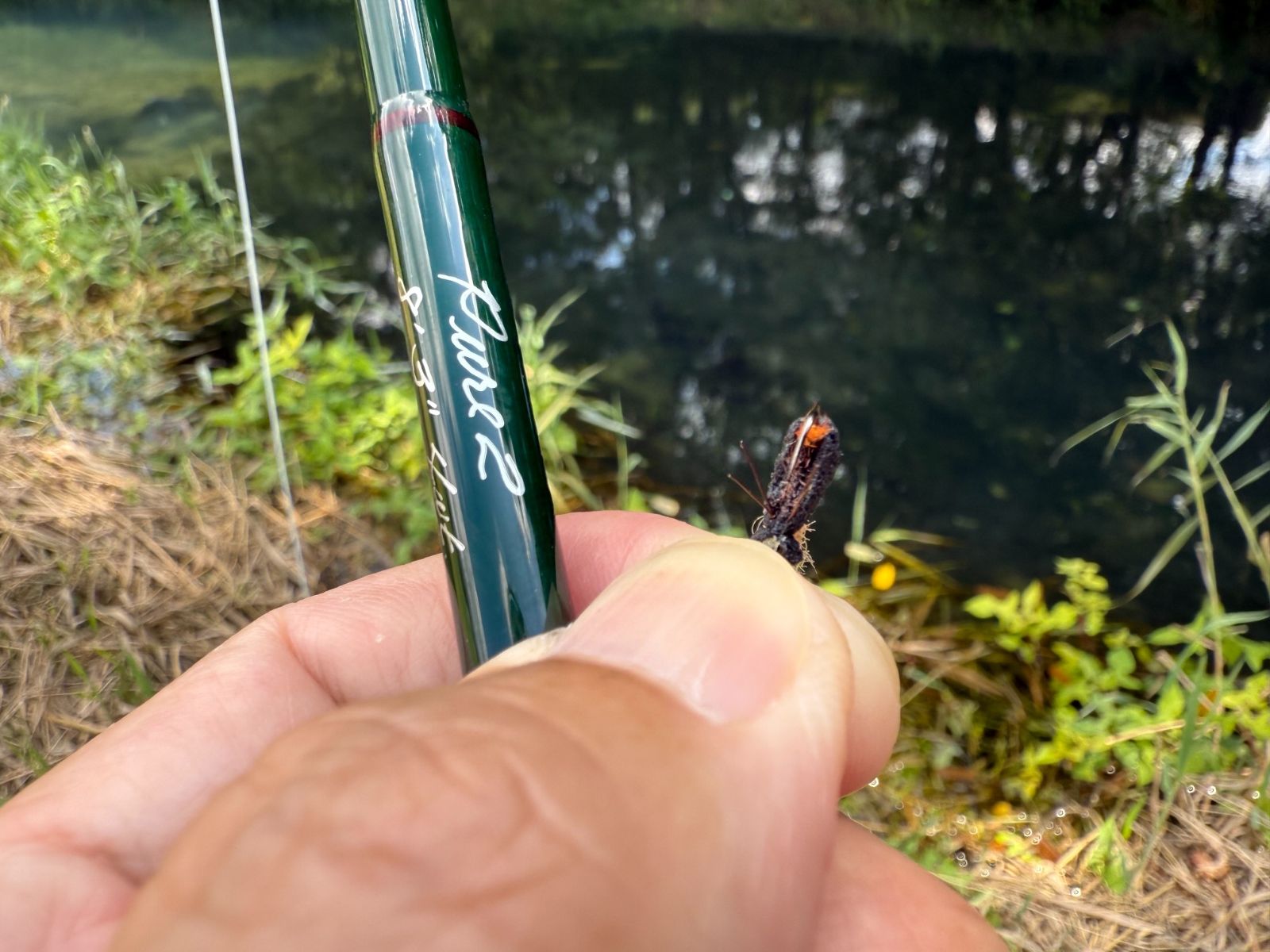 アント同様、夏の定番フライ・フォームビートルを結んだ。16番と小振りなサイズを選択したが、ワイドゲイプのフックに巻いてある。フォームビートルしては小さいサイズだが、それでもアントと比較すればボリューム感の違いは明白である。同じテレストリアルと言えども、先ほどまで流していたシルエットの小さなアントとは異なる印象のパターンとして機能することが期待できる。粘性の高いフロータントを使用することで浮力に持続性を持たせ、対岸のバンク際を下流へ向けてロングドリフトさせる。対岸を擦るくらいギリギリのコースを狙い、フライがバンクから離れないように手元のフライラインを繰り出した。