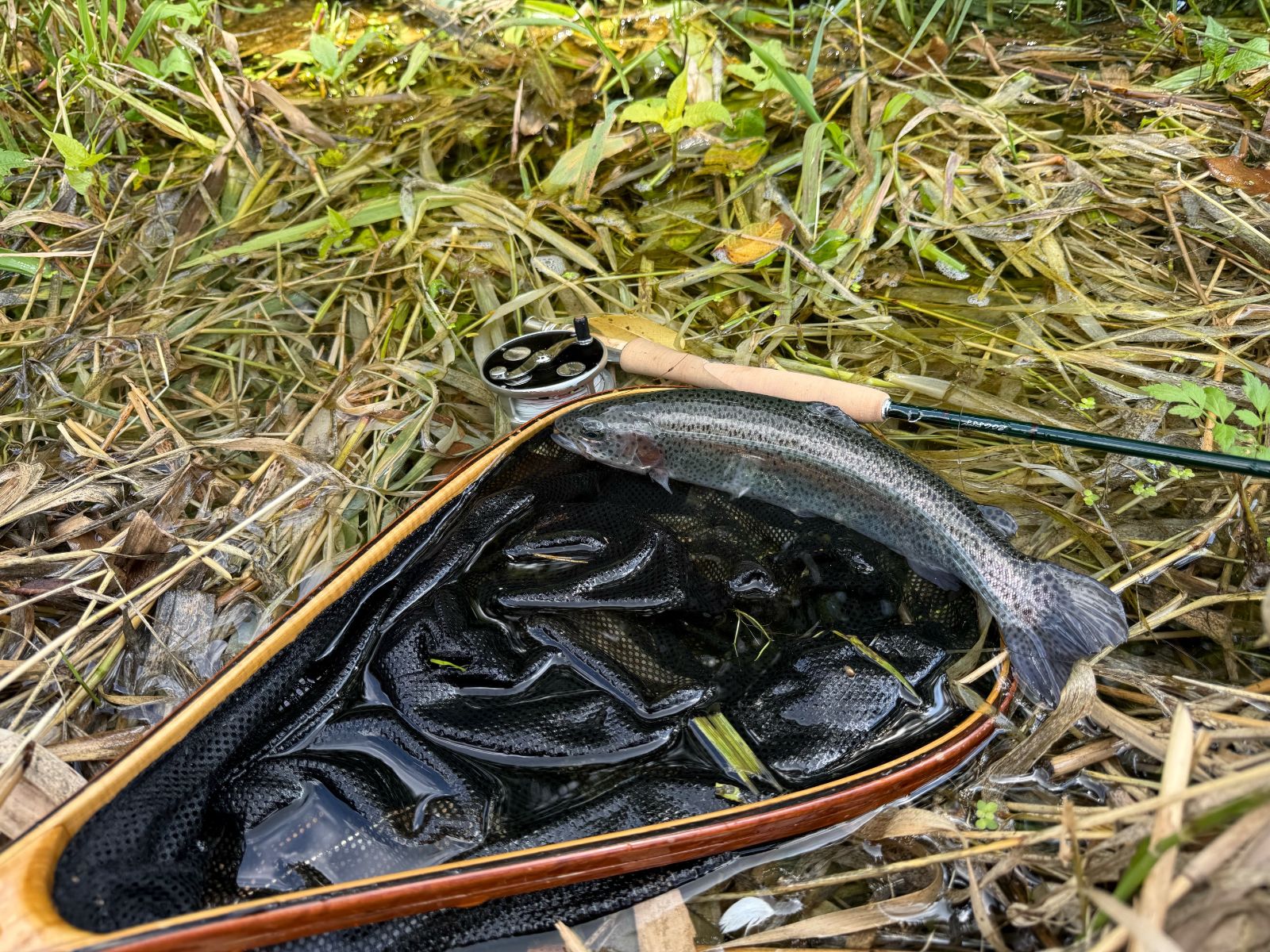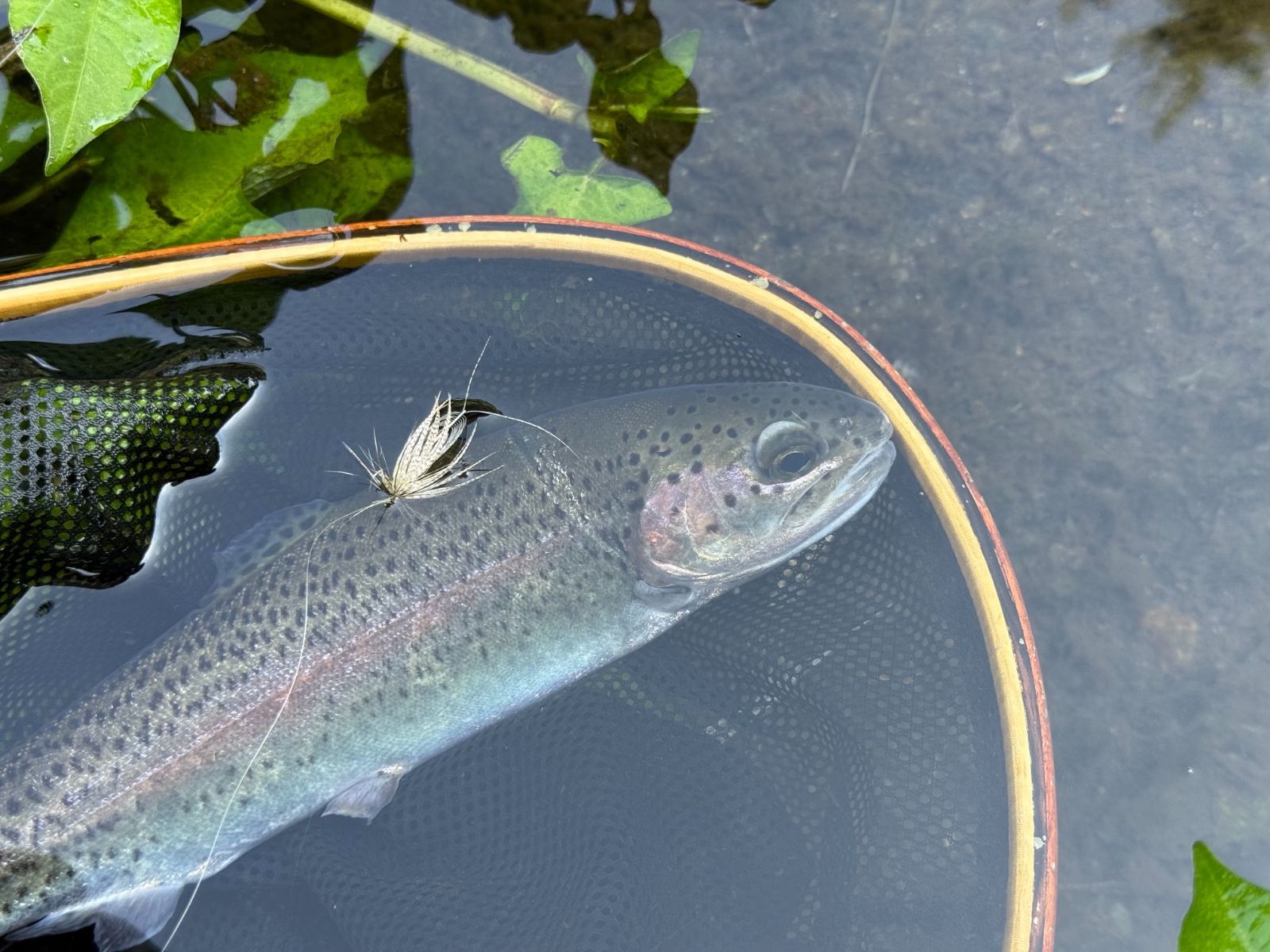 何度もキャストを繰り返し、たくさんのスラックを入れた状態でフライを最奥まで届けることができた時、大きなメンディングでキッチリとフライ先行の形を作ることができた。タイミングも悪くない。流れ下るフライに気付いたマスがゆっくりと浮上するようすがよく見えた。期待通り、完璧にフッキングしたツーフェザーフライは数度のジャンプでも外れることがなかった。放流間もない個体ではあったが、連続してバラした後だけにきちんと取り込めたことが純粋に嬉しい。