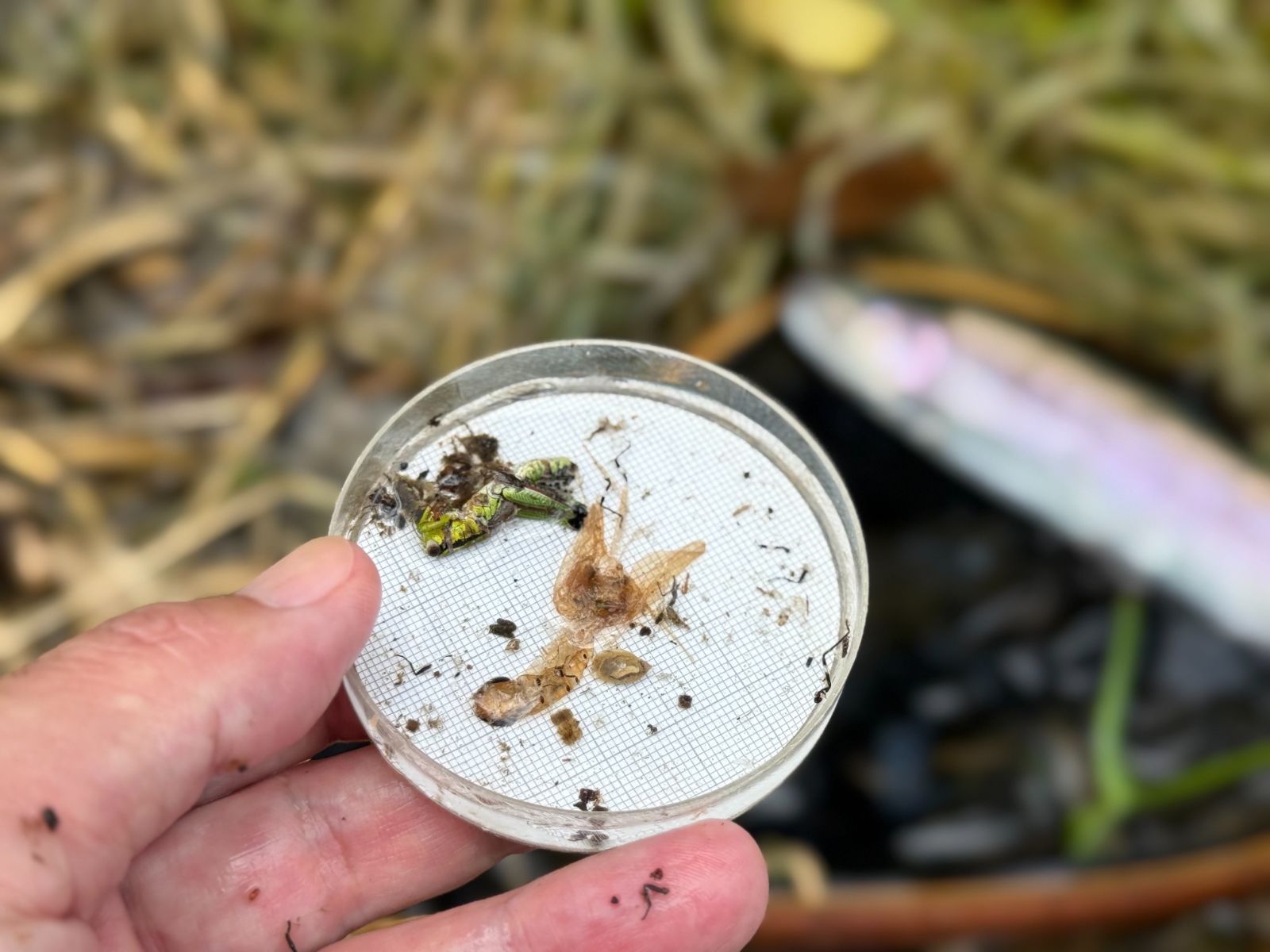 待望の1尾目。捕食されていたのはバッタとフタスジモンカゲロウのシャック。捕食物は予想していたよりも大きく、ヒットフライとなったフォームビートルとはサイズもボリューム感も異なる。しかし、それでも何とかマスに口を使わせることができるあたりが、このフライのポテンシャルなのだろう。
