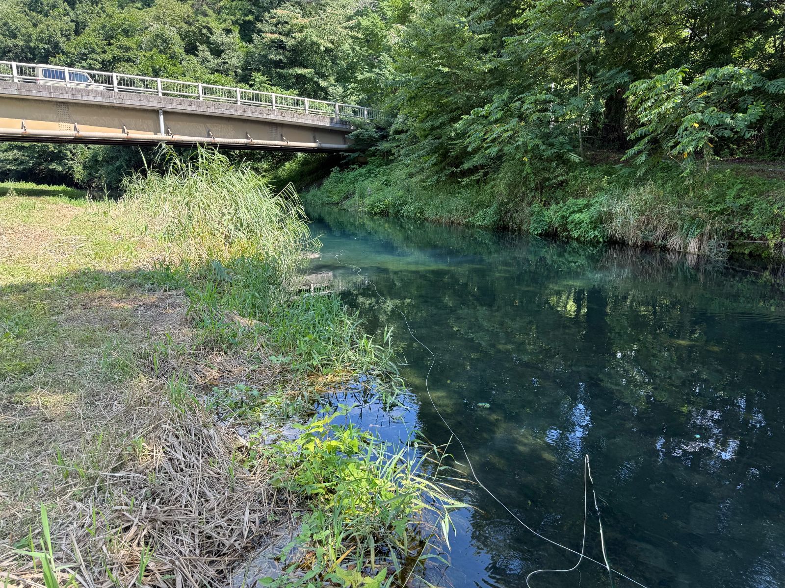 忍野を知るフライフィッシャーは、この季節・この時間帯、木陰でサオを振っているはずだ。当然ながら自分も暑さは避けたいところではあるのだが、忍野の代名詞的なポイントが貸切りなのであれば、スレきったマスの泳ぐフラットな流れでの修行も悪くないよう思えた。それに一見、陽を遮るものがなさそうな鐘ヶ淵堰堤にも日影が存在することを私は知っている。