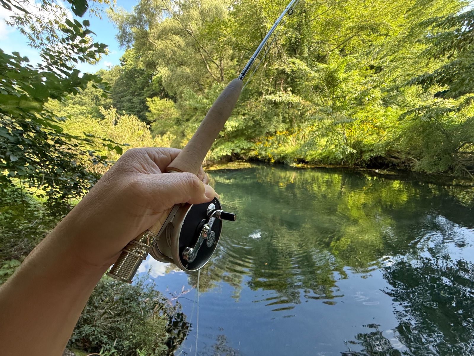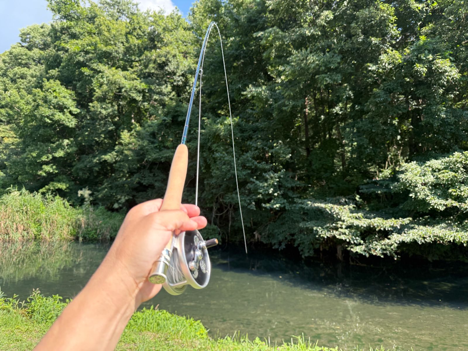 結んだままになっているツーフェザーフライの水気を切り、再度フロータントを擦り込んでねらってみることにした。ただの直感でしかなかったのだが、マスは急にスイッチが入ったように着水と同時にフライに襲いかかった。予想していたとは言え、あまりにも突然でマスも釣り人も大慌てになってしまった。立てたロッドのティップが頭上の枝に絡まり、マスはあらぬ方向へ跳ねまくった。スマートとは程遠いファイトだが、それでもフックは外れない。連続バラシが嘘のように感じられる。なかなか釣果に恵まれず苦労したが、夏らしい釣りを堪能することができた。